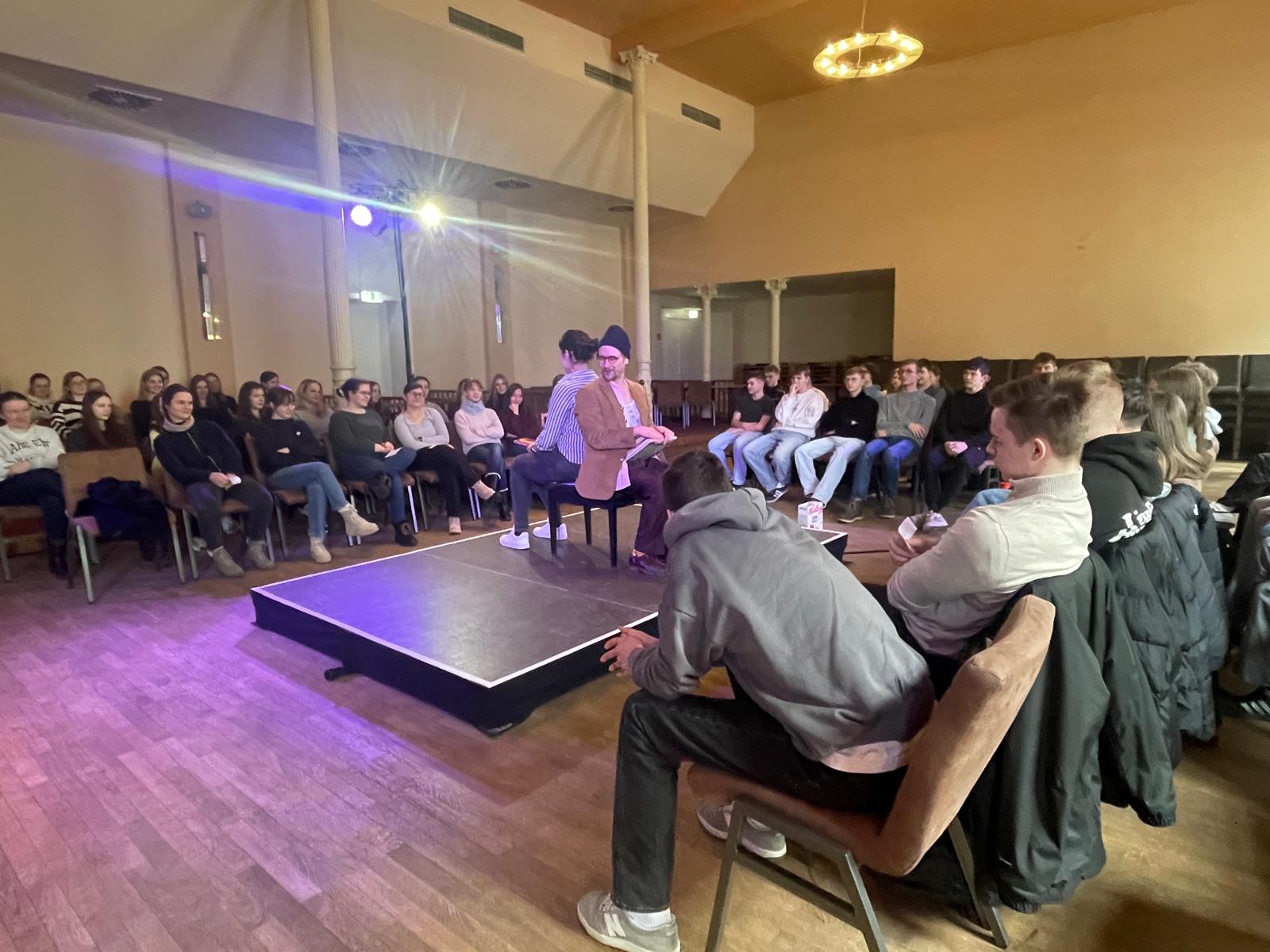 Am 18. Februar durfte der gesamte Jahrgang der neunten Klasse das Theaterstück „All das Schöne“ im Stadthaus in Elsterwerda besuchen. Schon beim Betreten des Saales war die Stimmung gespannt und neugierig. Das Stück wurde von einem einzelnen Schauspieler aufgeführt, der es schaffte, die Bühne ganz allein mit Leben zu füllen.